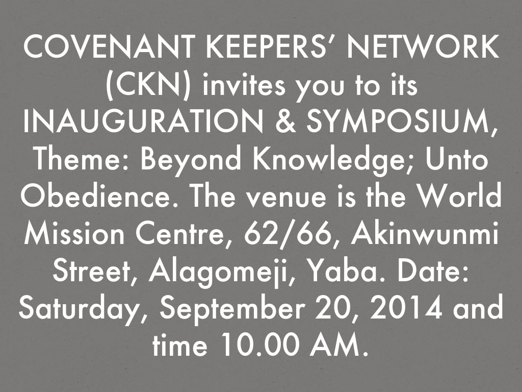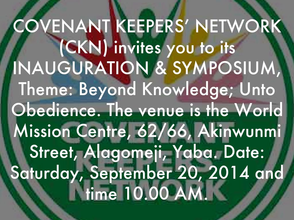 COVENANT KEEPERS’ NETWORK (CKN) invites you to its INAUGURATION & SYMPOSIUM, Theme: Beyond Knowledge; Unto Obedience. The venue is the World Mission Centre, 62/66, Akinwunmi Street, Alagomeji, Yaba. Date: Saturday, September 20, 2014 and time 10.00 AM.