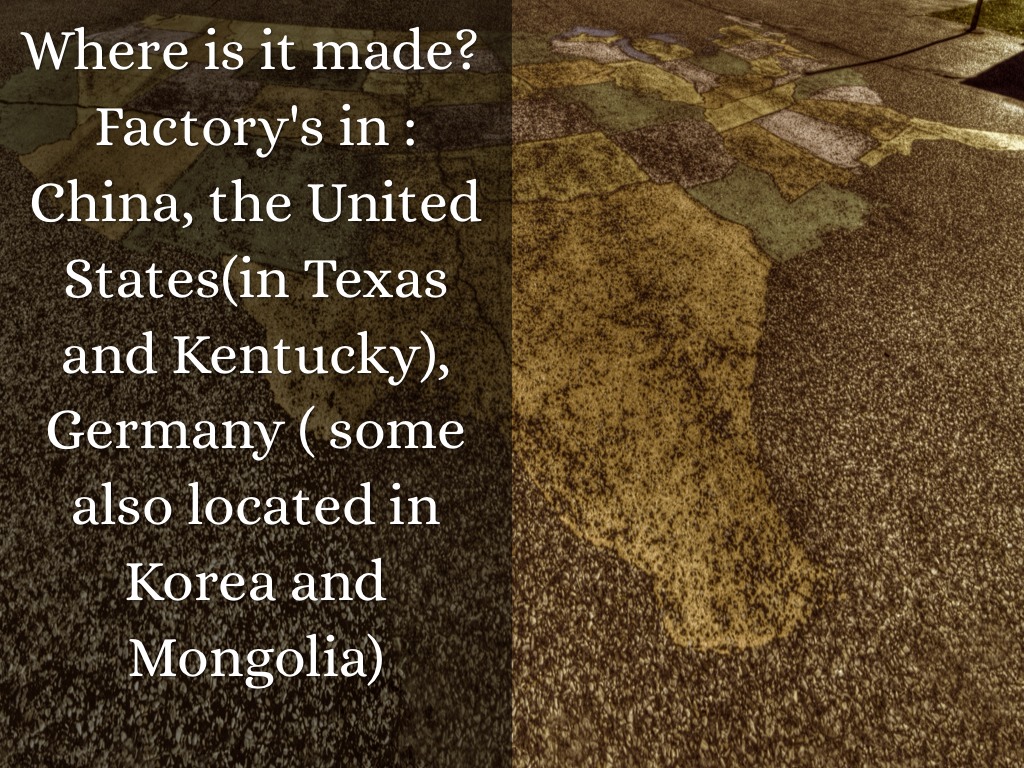 Where is it made? Factory's in : China, the United States(in Texas and Kentucky), Germany ( some also located in Korea and Mongolia)