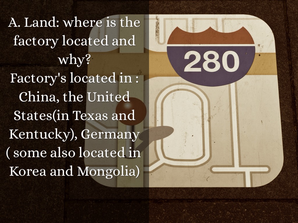 Factory's located in : China, the United States(in Texas and Kentucky), Germany ( some also located in Korea and Mongolia)