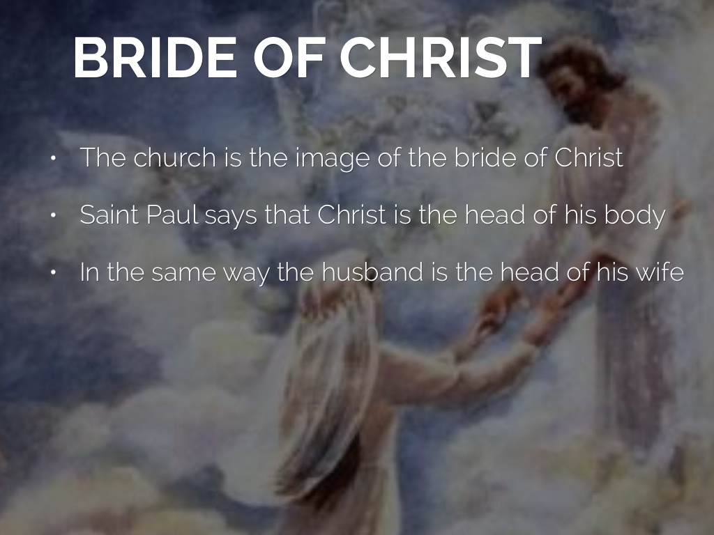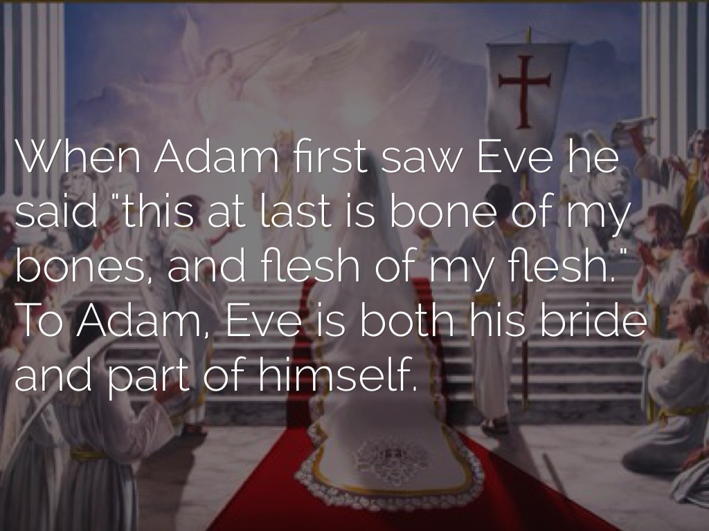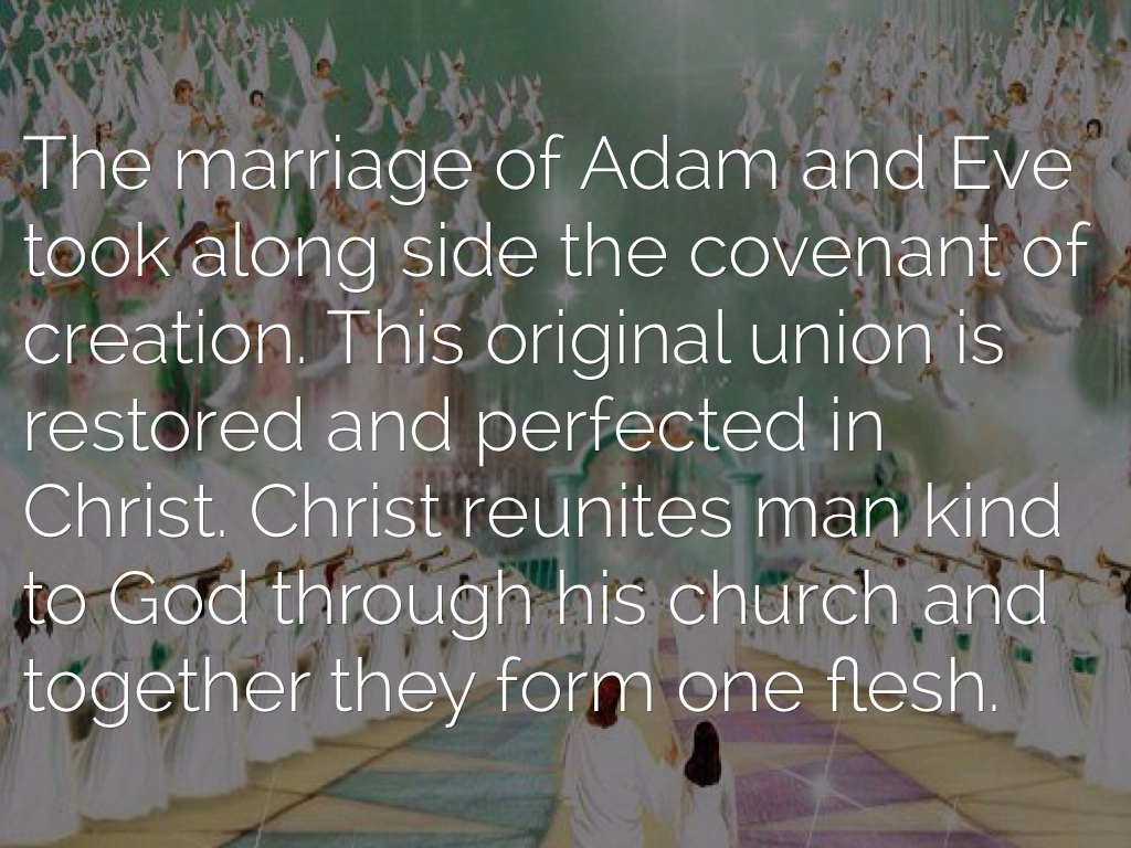 The marriage of Adam and Eve took along side the covenant of creation. This original union is restored and perfected in Christ. Christ reunites man kind to God through his church and together they form one flesh.