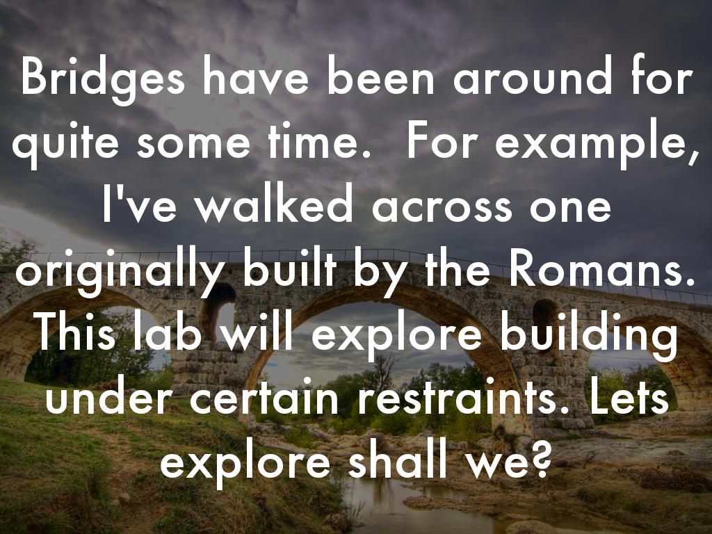 Bridges have been around for quite some time. For example, I've walked across one originally built by the Romans. This lab will explore building under certain restraints. Lets explore shall we?