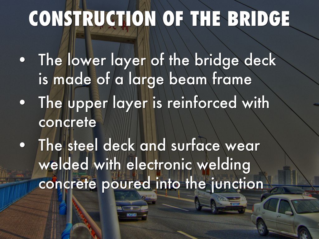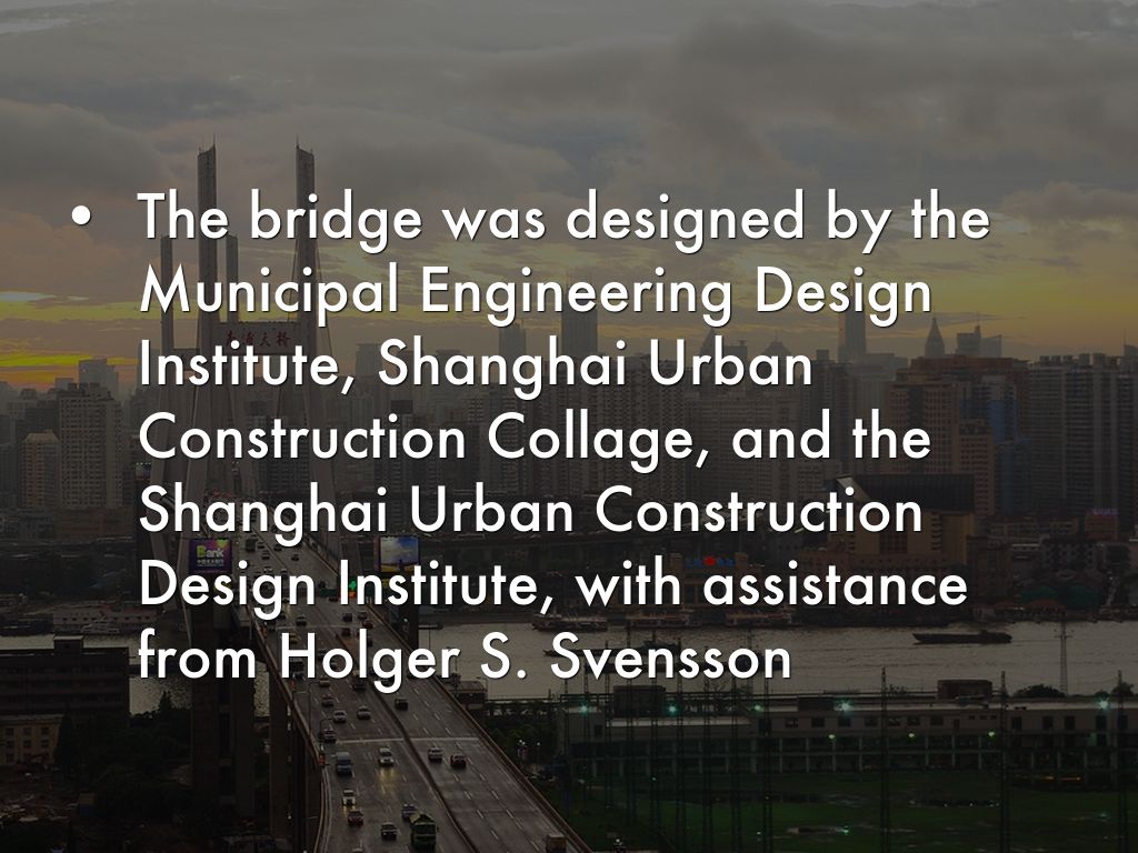 The bridge was designed by the Municipal Engineering Design Institute, Shanghai Urban Construction Collage, and the Shanghai Urban Construction Design Institute, with assistance from Holger S. Svensson