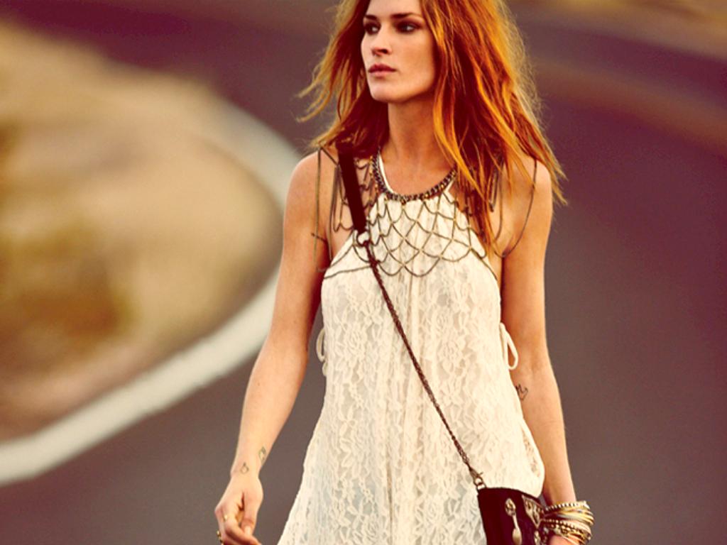 Dress designer who hand prints fabric and stitches maxi dresses with full skirts