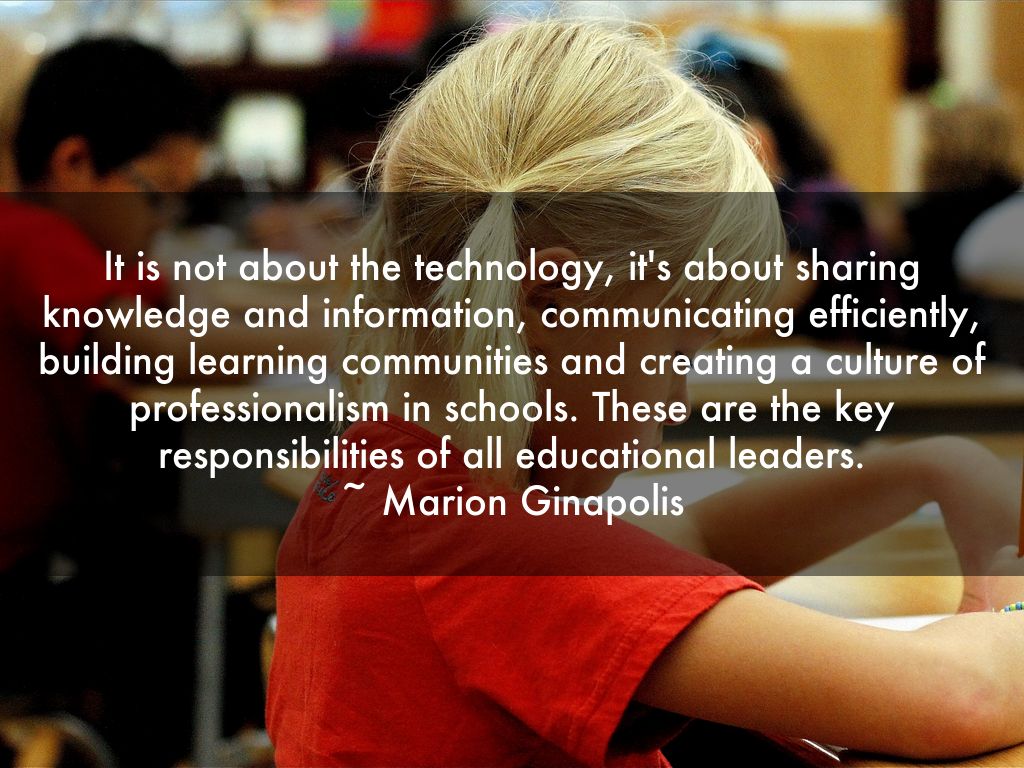 It is not about the technology, it's about sharing knowledge and information, communicating efficiently, building learning communities and creating a culture of professionalism in schools. These are the key responsibilities of all educational leaders. ~ Marion Ginapolis