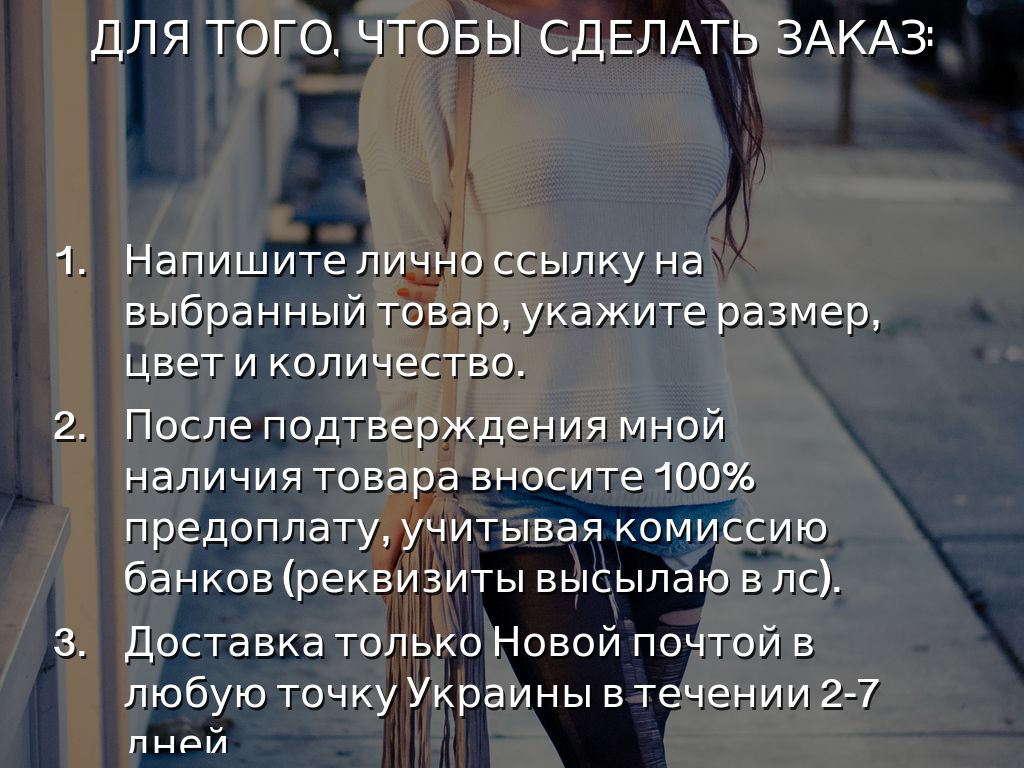 После подтверждения мной наличия товара вносите 100% предоплату, учитывая комиссию банков (реквизиты высылаю в лс).