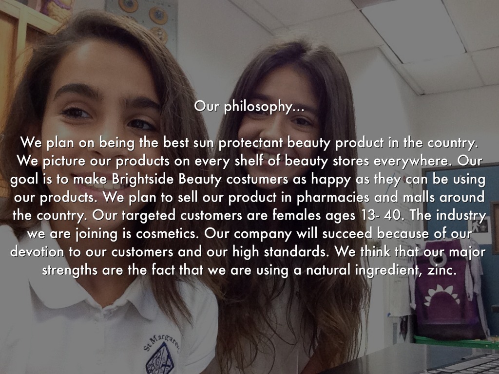 We plan on being the best sun protectant beauty product in the country. We picture our products on every shelf of beauty stores everywhere. Our goal is to make Brightside Beauty costumers as happy as they can be using our products. We plan to sell our product in pharmacies and malls around the country. Our targeted customers are females ages 13- 40. The industry we are joining is cosmetics. Our company will succeed because of our devotion to our customers and our high standards. We think that our major strengths are the fact that we are using a natural ingredient, zinc.
