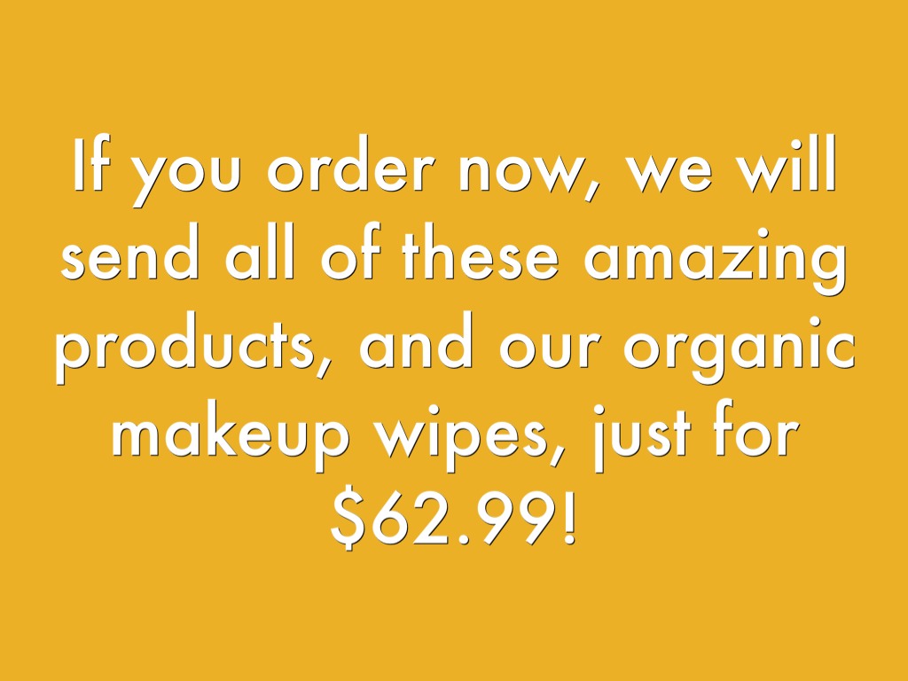 If you order now, we will send all of these amazing products, and our organic makeup wipes, just for $62.99!