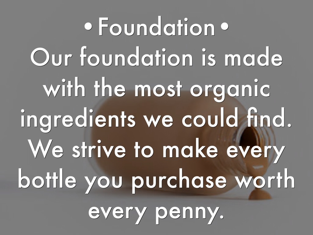 Our foundation is made with the most organic ingredients we could find. We strive to make every bottle you purchase worth every penny.