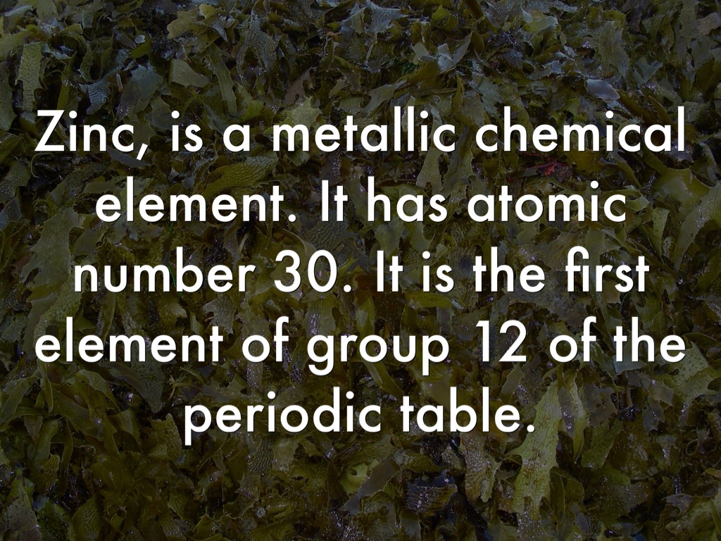 Zinc, is a metallic chemical element. It has atomic number 30. It is the first element of group 12 of the periodic table.