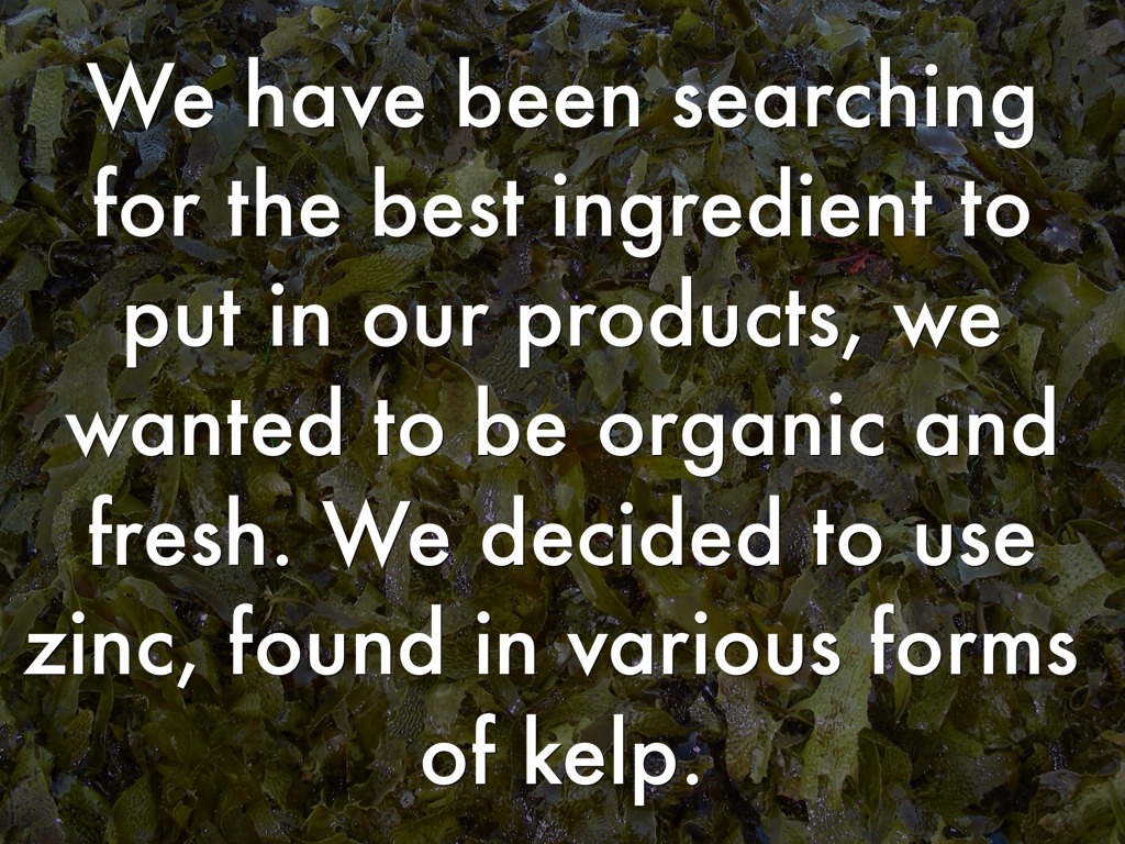 We have been searching for the best ingredient to put in our products, we wanted to be organic and fresh. We decided to use zinc, found in various forms of kelp.