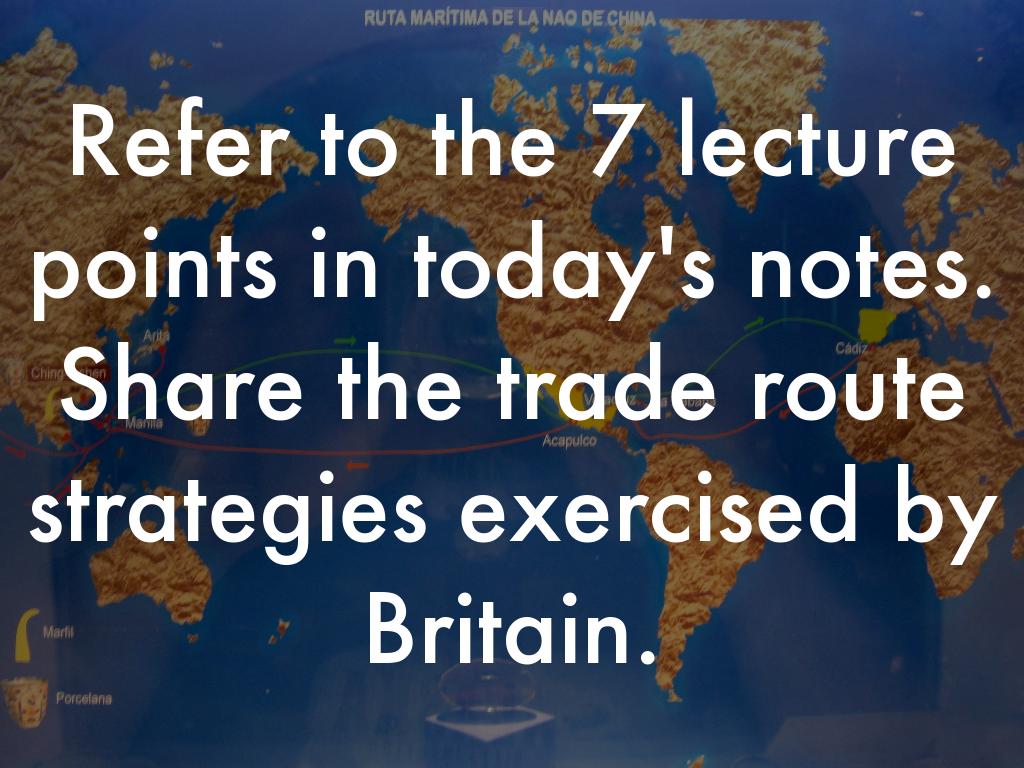 Refer to the 7 lecture points in today's notes. Share the trade route strategies exercised by Britain.