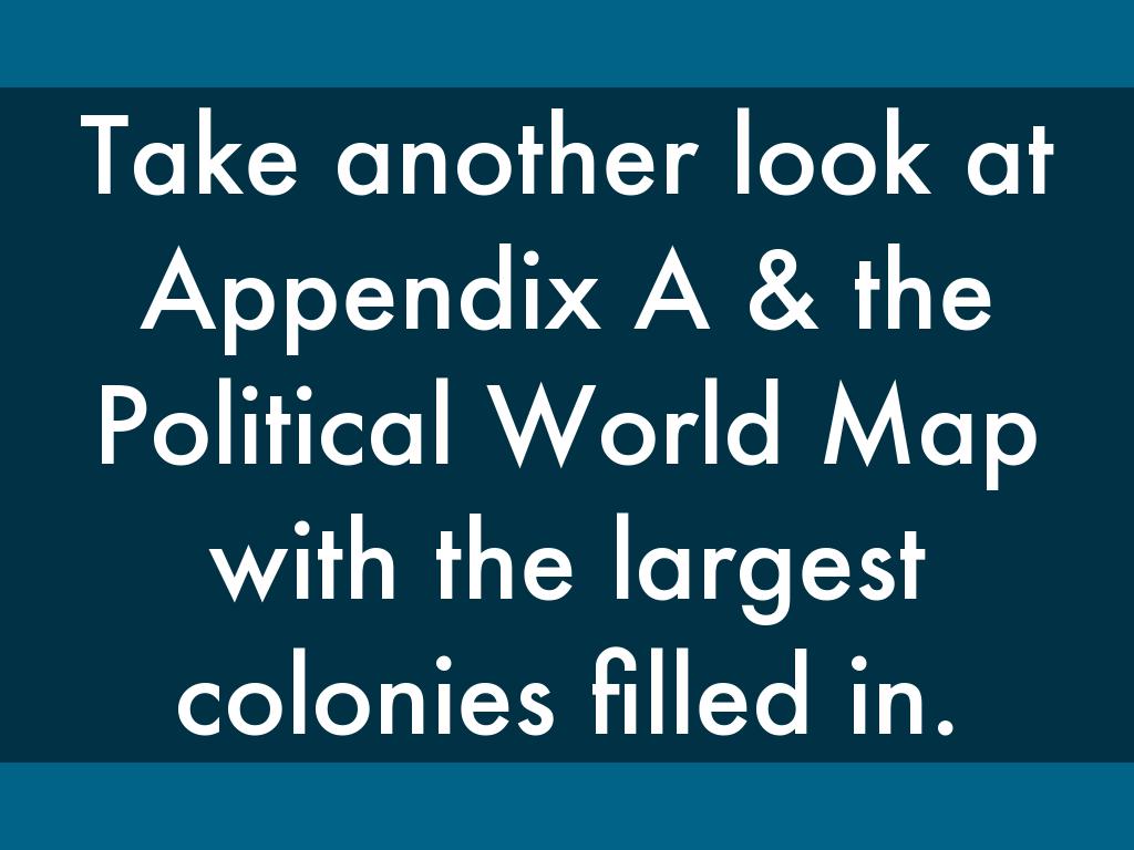 Take another look at Appendix A & the Political World Map with the largest colonies filled in.