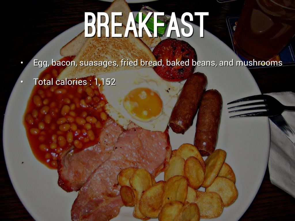 Egg, bacon, suasages, fried bread, baked beans, and mushrooms