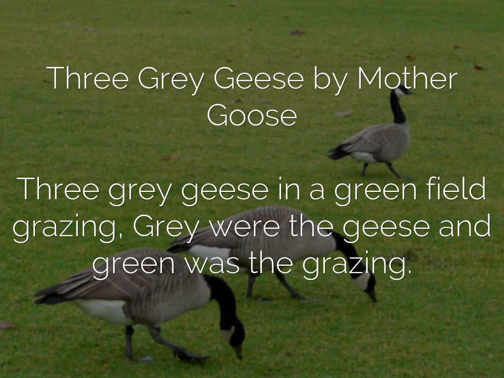 Three grey geese in a green field grazing, Grey were the geese and green was the grazing.