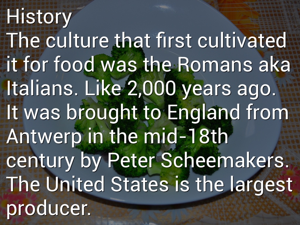 History The culture that first cultivated it for food was the Romans aka Italians. Like 2,000 years ago. It was brought to England from Antwerp in the mid-18th century by Peter Scheemakers. The United States is the largest producer.