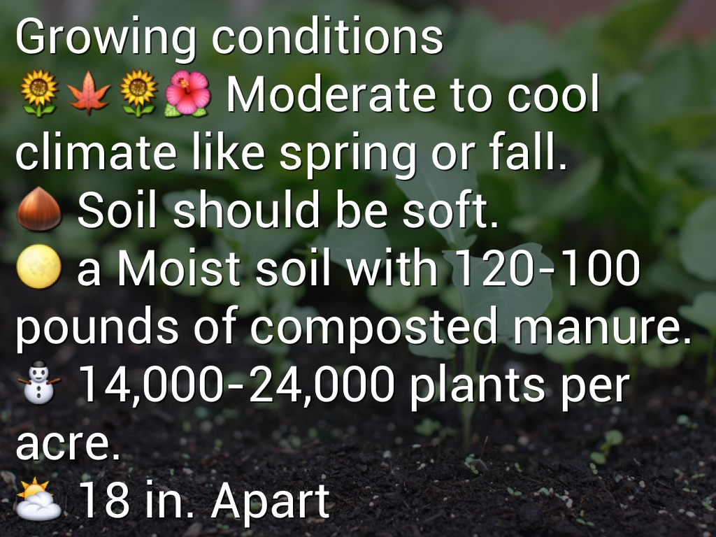 Growing conditions 🌻🍁🌻🌺 Moderate to cool climate like spring or fall. 🌰 Soil should be soft. 🌕 a Moist soil with 120-100 pounds of composted manure. ⛄️ 14,000-24,000 plants per acre. ⛅️ 18 in. Apart