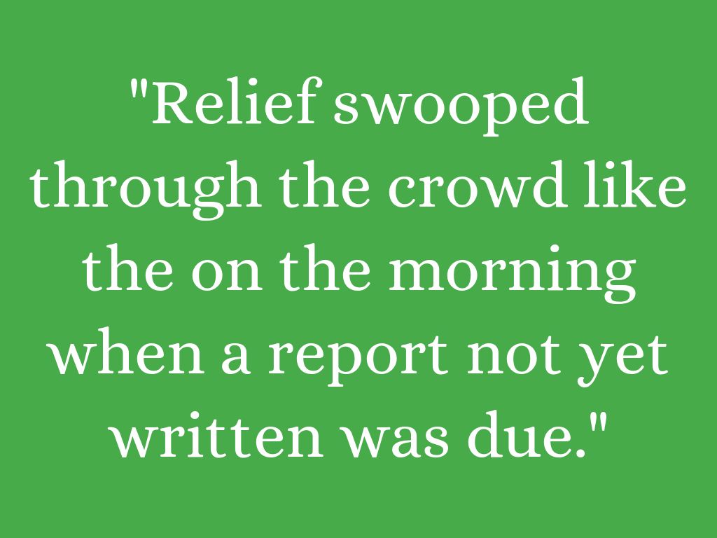 "Relief swooped through the crowd like the on the morning when a report not yet written was due."