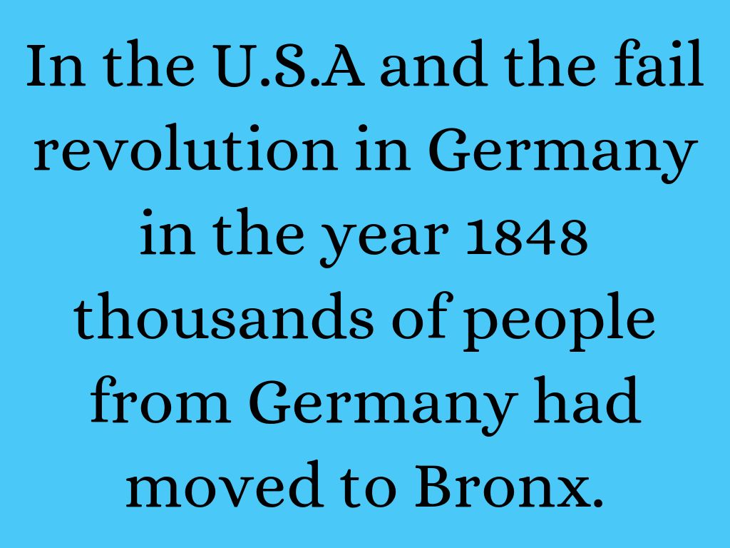 In the U.S.A and the fail revolution in Germany in the year 1848 thousands of people from Germany had moved to Bronx.