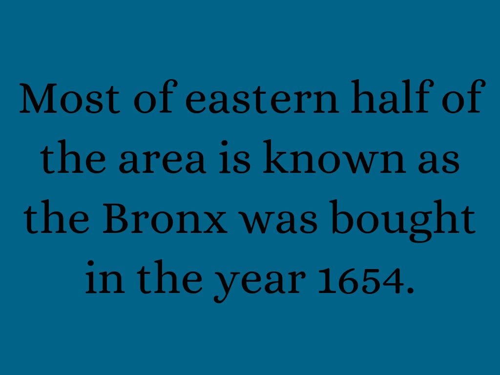 Most of eastern half of the area is known as the Bronx was bought in the year 1654.