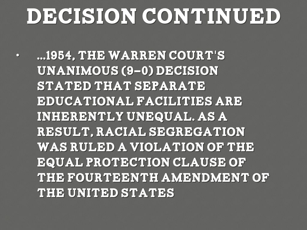 ...1954, the Warren Court's unanimous (9–0) decision stated that separate educational facilities are inherently unequal. As a result, racial segregation was ruled a violation of the Equal Protection Clause of the Fourteenth Amendment of the United States Constitution. This ruling paved the way for integration and was a major victory of the Civil Rights Movement.