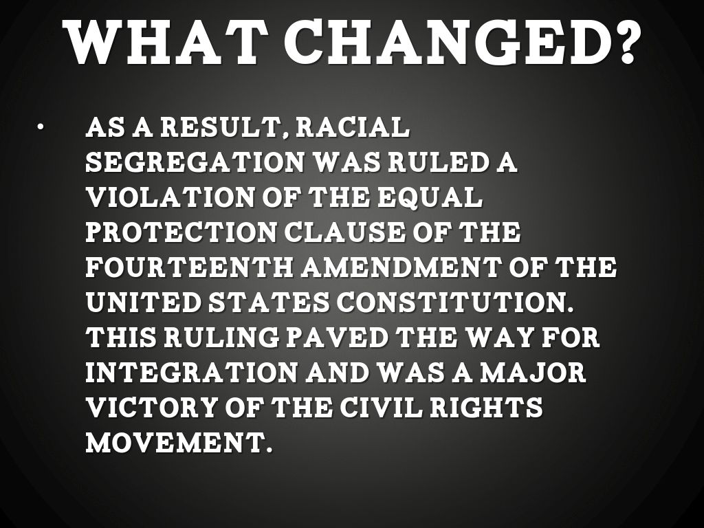 As a result, racial segregation was ruled a violation of the Equal Protection Clause of the Fourteenth Amendment of the United States Constitution. This ruling paved the way for integration and was a major victory of the Civil Rights Movement.