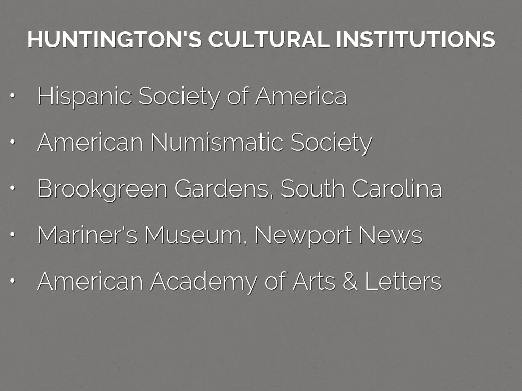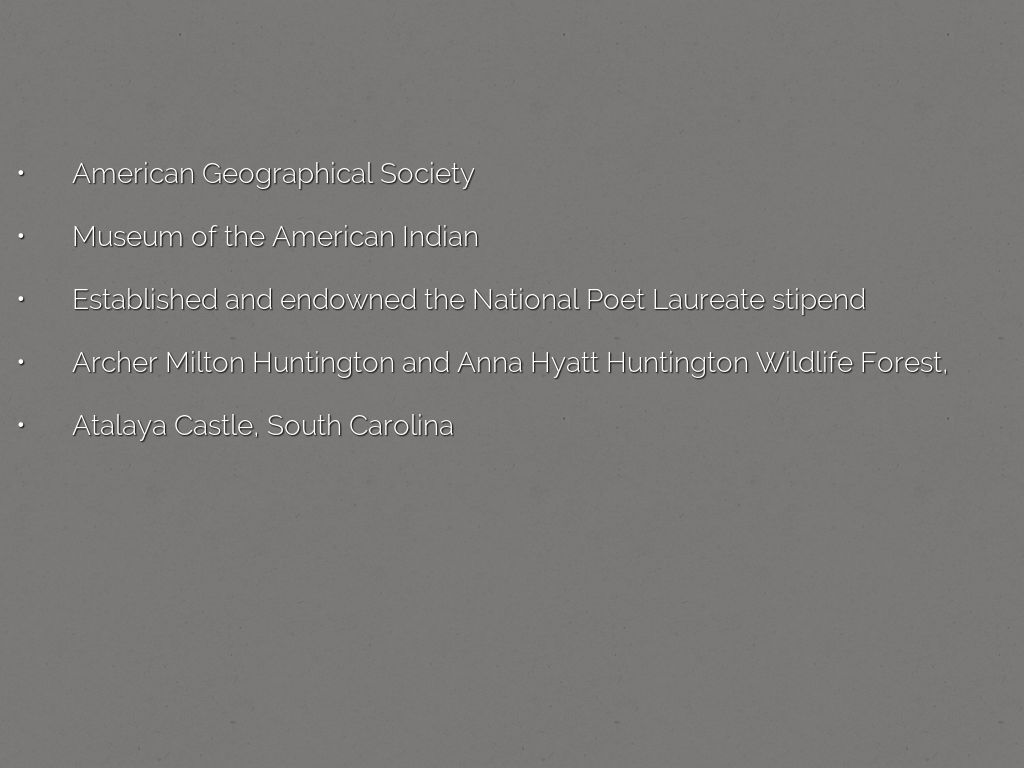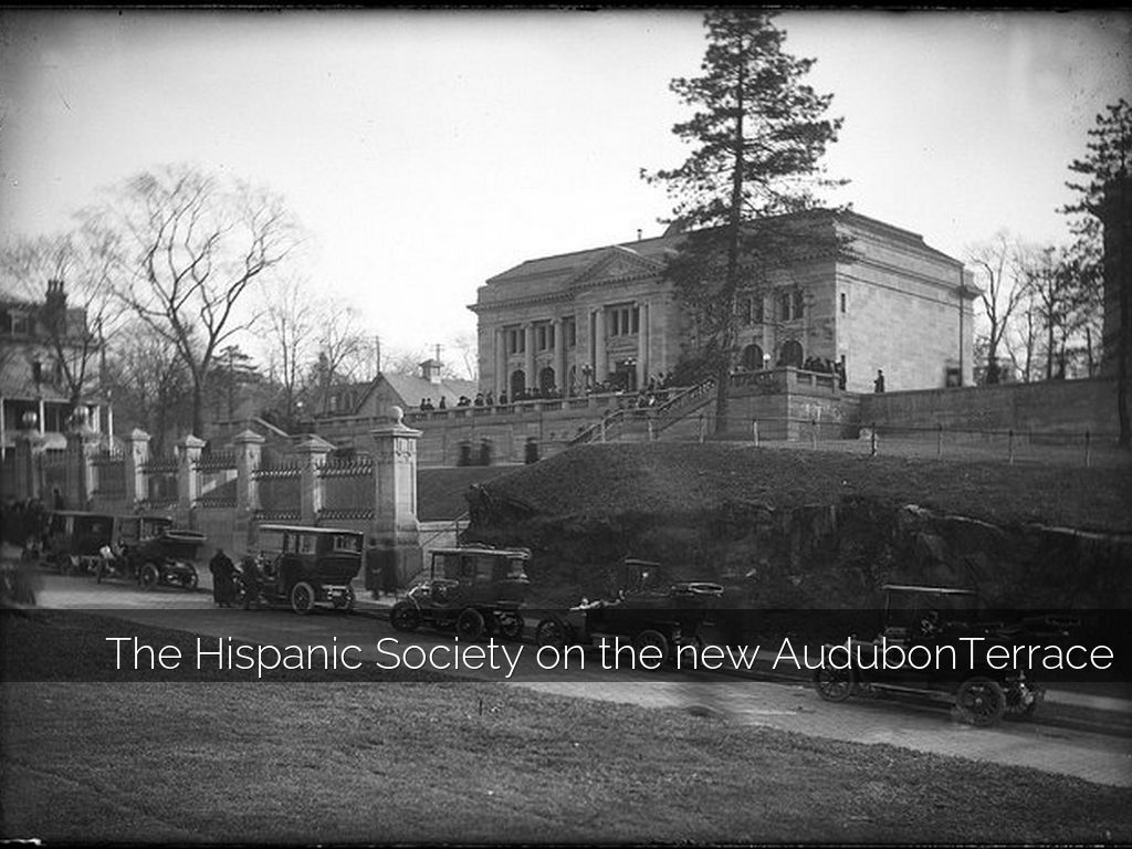 http://learn.columbia.edu/hispanic/essays/beaux-arts.php"This complex provided a single location in which one could study and admire the accomplishments of a once-powerful empire of the Old World (the Hispanic Society); the artistry of the money used by a variety of world civilizations (the American Numismatic Society); current thinking and efforts on how best to document and describe the full extent of the globe (the American Geographical Society); the culture of "primitive" peoples whose "disappearance" was thought a necessary, if tragic, side effect of the march of civilization (the Museum of the American Indian); and the works of the nation's finest artists (the American Academy of Arts and Letters and the National Institute of Arts and Letters). In this thematic unity we may discover the personal interests of Archer Milton Huntington, the wealthy patron who brought these institutions together on Audubon Terrace. More broadly, however, it may be read as the preoccupations of an entire nation poised to assume its role as a civilization for the ages."