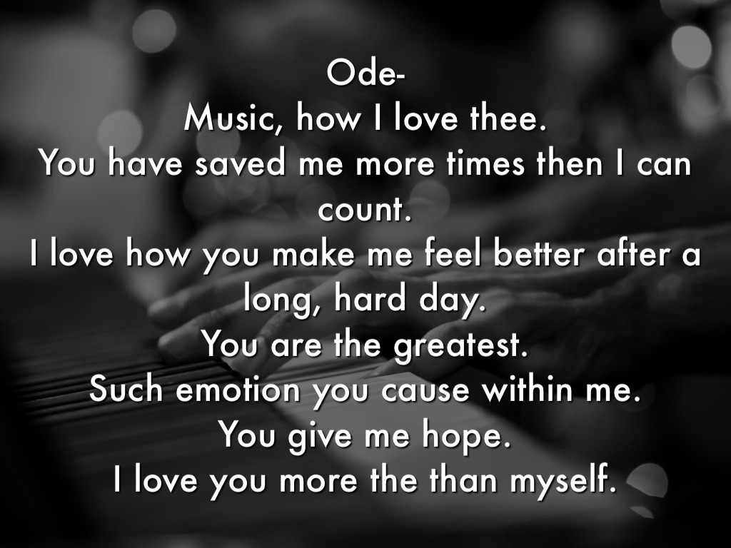 Ode- Music, how I love thee. You have saved me more times then I can count. I love how you make me feel better after a long, hard day. You are the greatest. Such emotion you cause within me. You give me hope. I love you more the than myself.