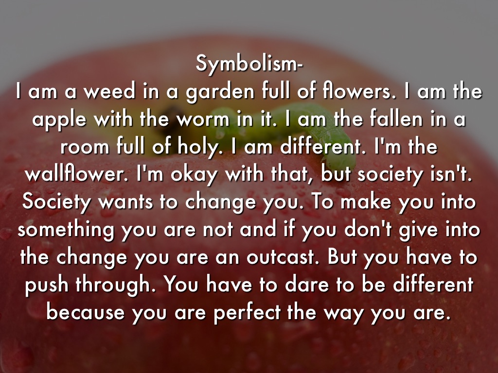 Symbolism- I am a weed in a garden full of flowers. I am the apple with the worm in it. I am the fallen in a room full of holy. I am different. I'm the wallflower. I'm okay with that, but society isn't. Society wants to change you. To make you into something you are not and if you don't give into the change you are an outcast. But you have to push through. You have to dare to be different because you are perfect the way you are.