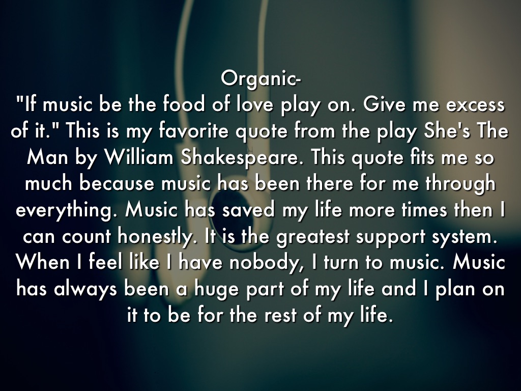 Organic- "If music be the food of love play on. Give me excess of it." This is my favorite quote from the play She's The Man by William Shakespeare. This quote fits me so much because music has been there for me through everything. Music has saved my life more times then I can count honestly. It is the greatest support system. When I feel like I have nobody, I turn to music. Music has always been a huge part of my life and I plan on it to be for the rest of my life.