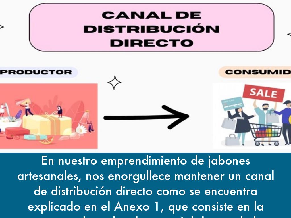 En nuestro emprendimiento de jabones artesanales, nos enorgullece mantener un canal de distribución directo como se encuentra explicado en el Anexo 1, que consiste en la apertura de un local comercial dentro de la parroquia "El Batán" y una página online denominaba "bubblenatural1".