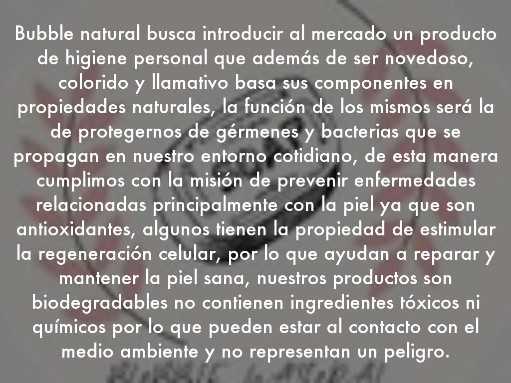 Bubble natural busca introducir al mercado un producto de higiene personal que además de ser novedoso, colorido y llamativo basa sus componentes en propiedades naturales, la función de los mismos será la de protegernos de gérmenes y bacterias que se propagan en nuestro entorno cotidiano, de esta manera cumplimos con la misión de prevenir enfermedades relacionadas principalmente con la piel ya que son antioxidantes, algunos tienen la propiedad de estimular la regeneración celular, por lo que ayudan a reparar y mantener la piel sana, nuestros productos son biodegradables no contienen ingredientes tóxicos ni químicos por lo que pueden estar al contacto con el medio ambiente y no representan un peligro.