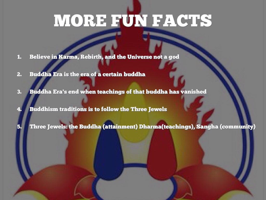 Three Jewels: the Buddha (attainment) Dharma(teachings), Sangha (community)
