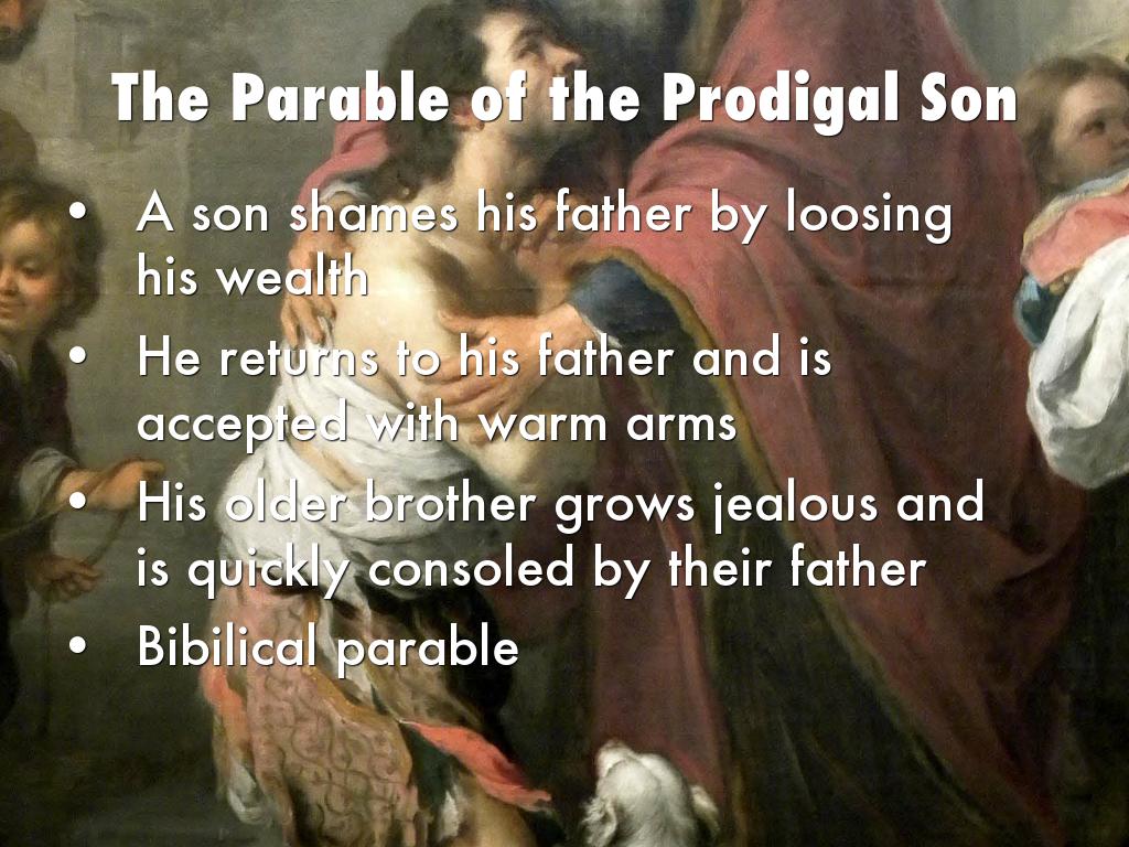 The parable of the prodigal son focuses first on a young conceited son, who squandered his father's wealth. After losing everything he is forced to go home, embarrassed and ashamed of his actions. Even though he has disgraced his father,he accepts him with love, affection, and a feast. Meanwhile, the oldest son who has remained faithful to his father, feels betrayed. His unfaithful and selfish little brother has been thrown a feast; while, he has been given nothing. The father is quick to console and comfort both of his children, showing his kind nature and love for his children.