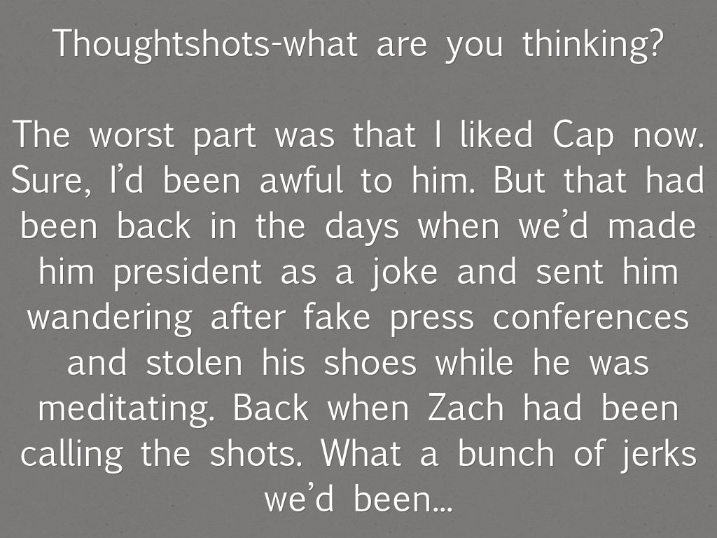 The worst part was that I liked Cap now. Sure, I’d been awful to him. But that had been back in the days when we’d made him president as a joke and sent him wandering after fake press conferences and stolen his shoes while he was meditating. Back when Zach had been calling the shots. What a bunch of jerks we’d been...