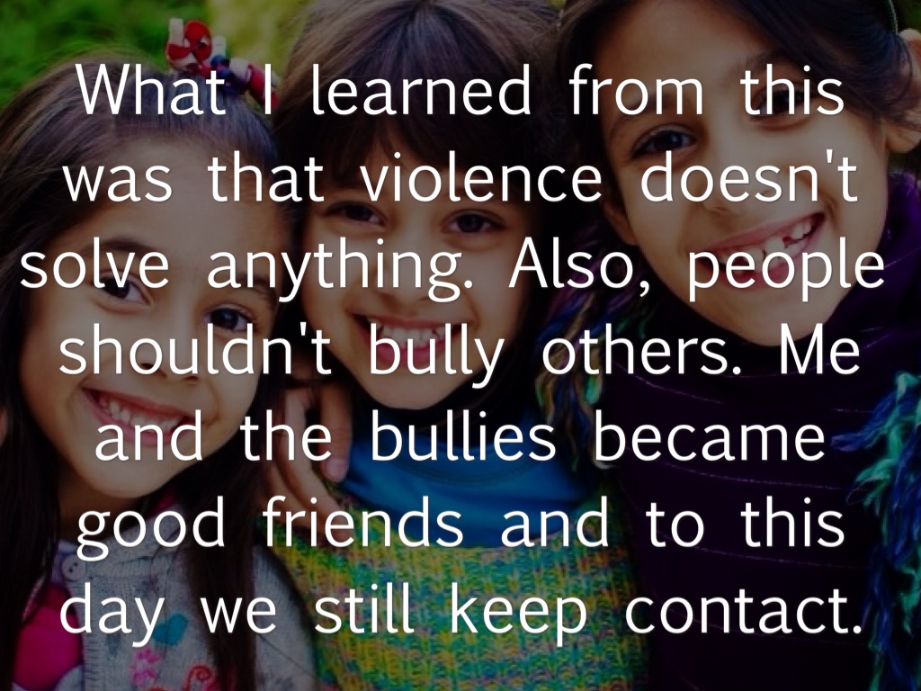 What I learned from this was that violence doesn't solve anything. Also, people shouldn't bully others. Me and the bullies became good friends and to this day we still keep contact.