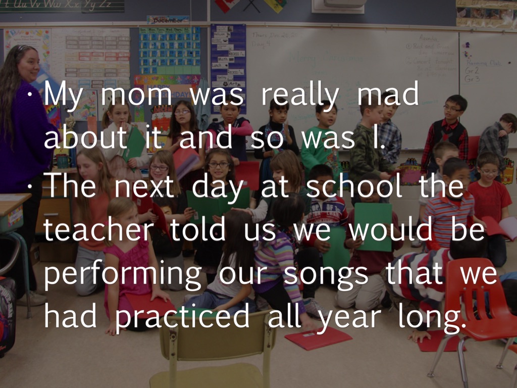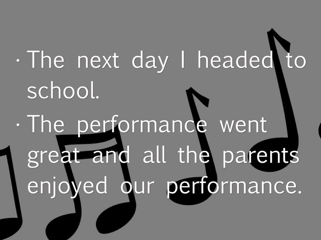The next day at school the teacher told us we would be performing our songs that we had practiced all year long.