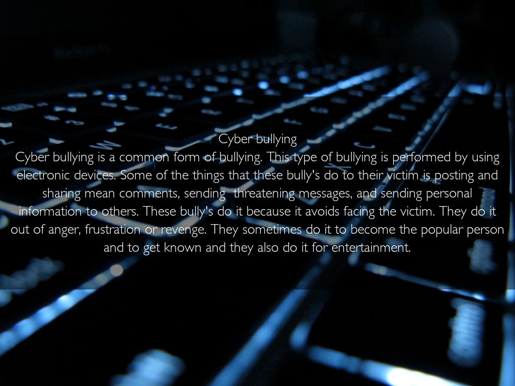 Cyber bullying Cyber bullying is a common form of bullying. This type of bullying is performed by using electronic devices. Some of the things that these bully's do to their victim is posting and sharing mean comments, sending threatening messages, and sending personal information to others. These bully's do it because it avoids facing the victim. They do it out of anger, frustration or revenge. They sometimes do it to become the popular person and to get known and they also do it for entertainment.