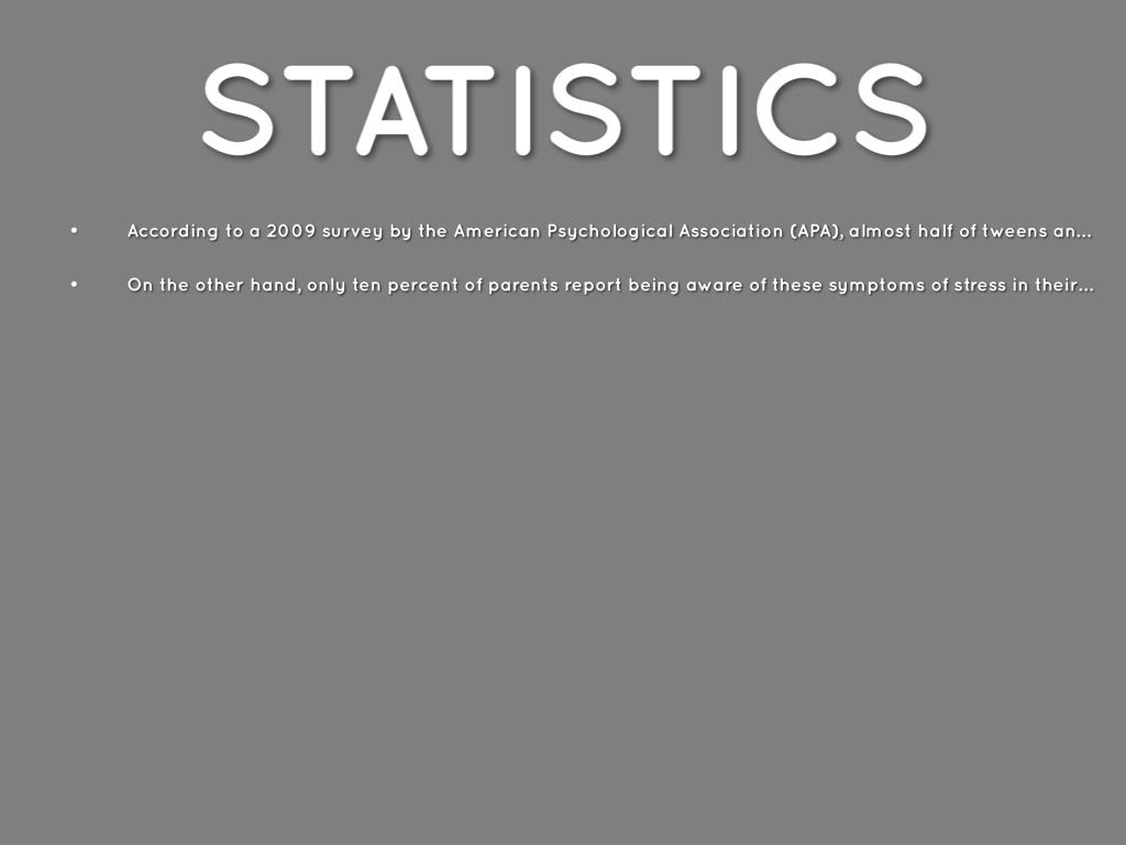 According to a 2009 survey by the American Psychological Association (APA), almost half of tweens and teens report suffering from headaches, sleep difficulty, and eating disorders due to stress in their everyday life.