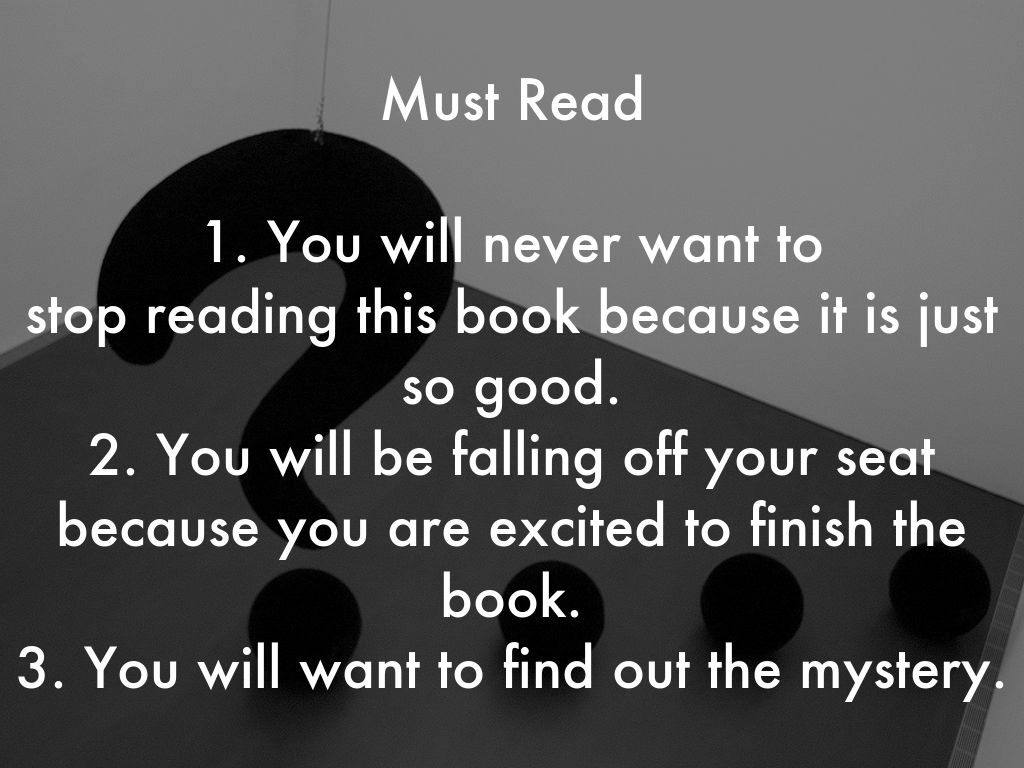 1. You will never want to stop reading this book because it is just so good. 2. You will be falling off your seat because you are excited to finish the book. 3. You will want to find out the mystery.