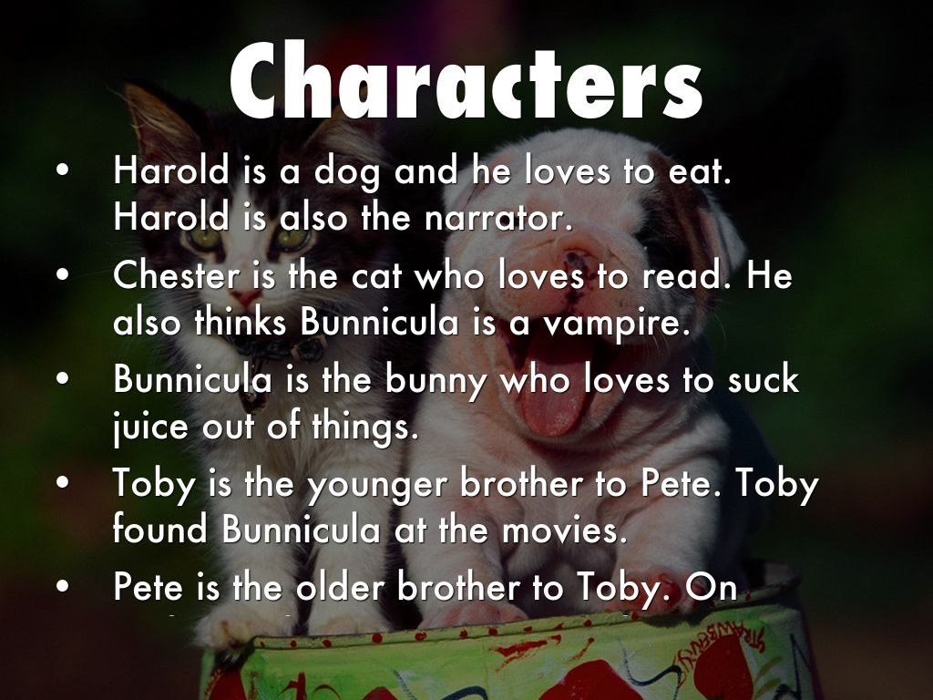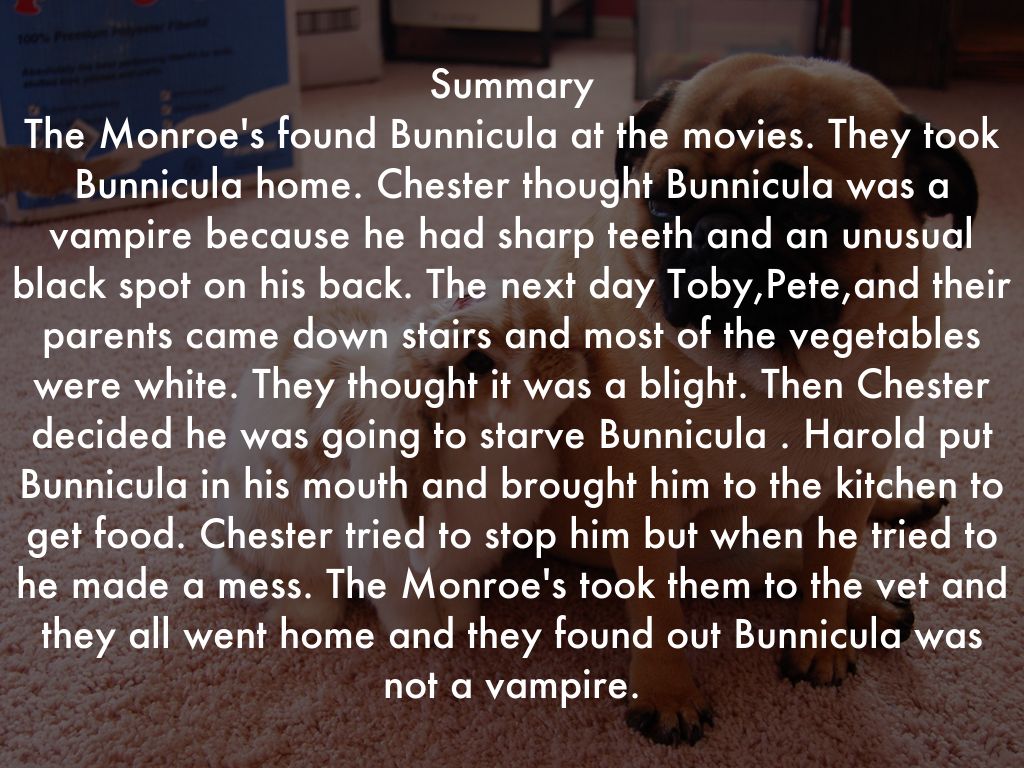 Summary The Monroe's found Bunnicula at the movies. They took Bunnicula home. Chester thought Bunnicula was a vampire because he had sharp teeth and an unusual black spot on his back. The next day Toby,Pete,and their parents came down stairs and most of the vegetables were white. They thought it was a blight. Then Chester decided he was going to starve Bunnicula . Harold put Bunnicula in his mouth and brought him to the kitchen to get food. Chester tried to stop him but when he tried to he made a mess. The Monroe's took them to the vet and they all went home and they found out Bunnicula was not a vampire.