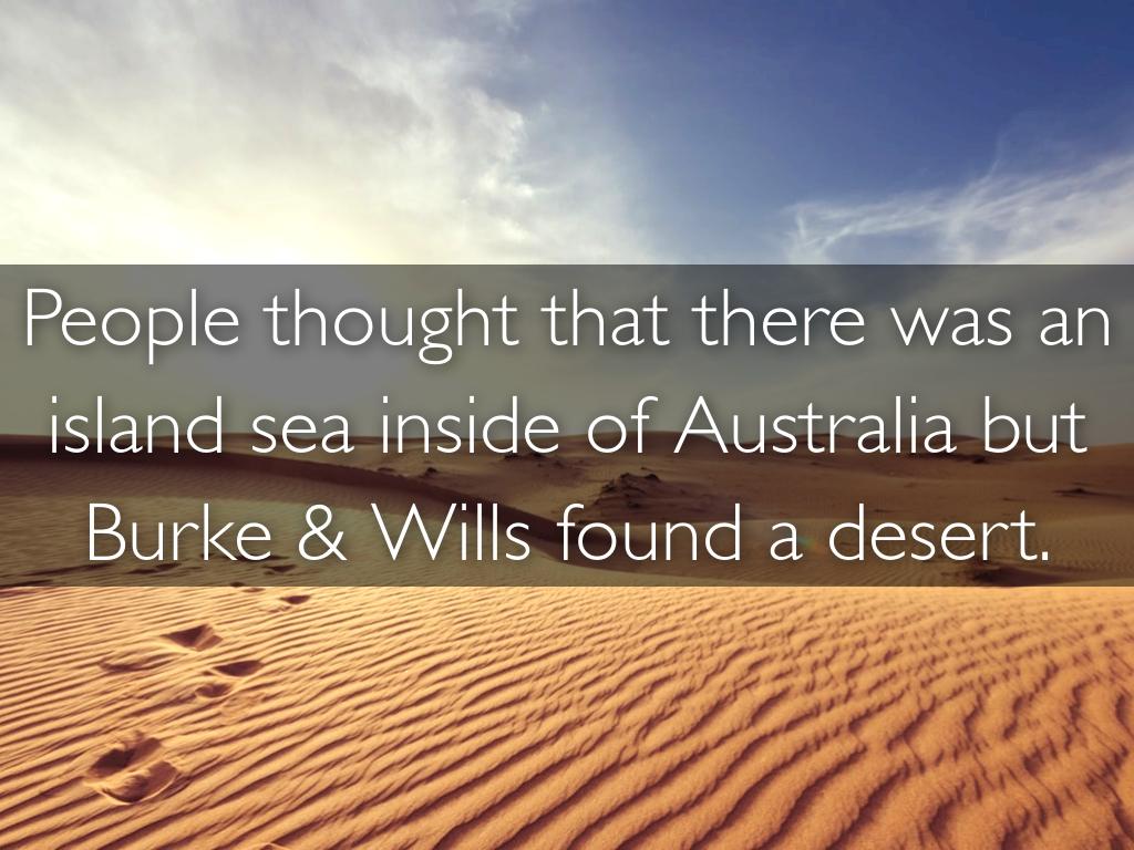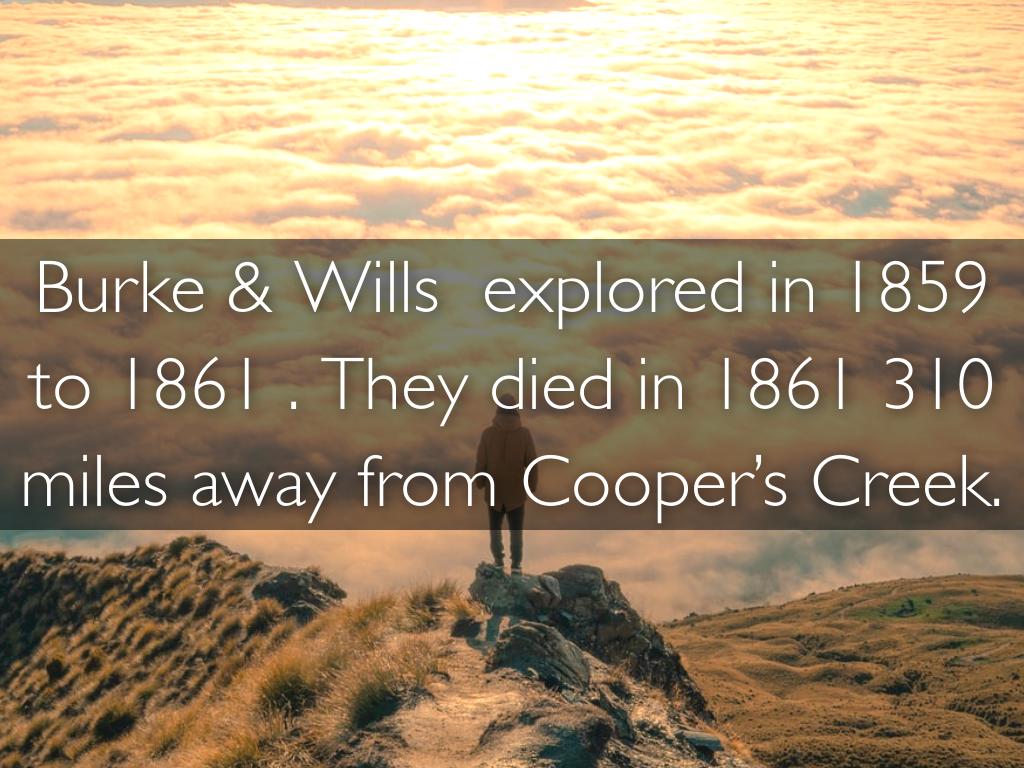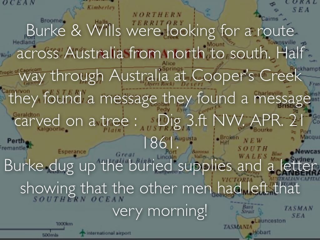 Burke & Wills were looking for a route across Australia from north to south. Half way through Australia at Cooper’s Creek they found a message they found a message carved on a tree : Dig 3.ft NW. APR. 21 1861.
