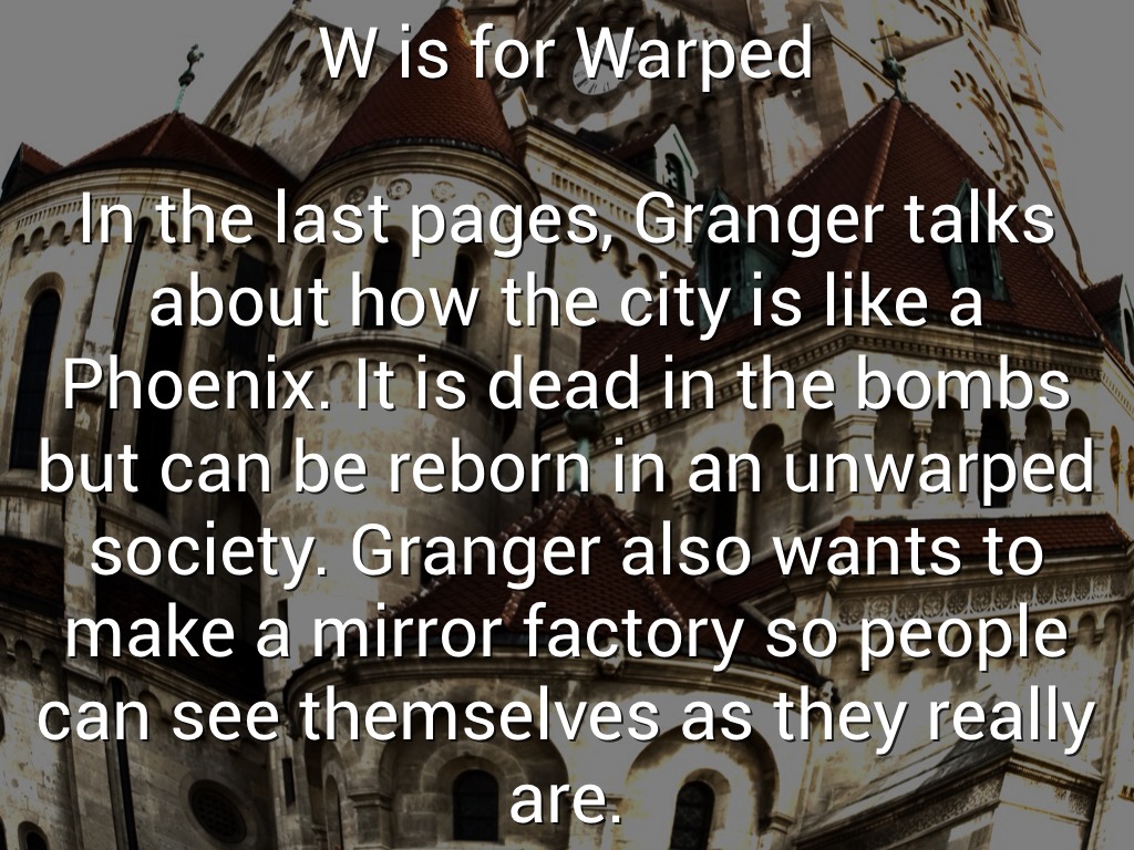 In the last pages, Granger talks about how the city is like a Phoenix. It is dead in the bombs but can be reborn in an unwarped society. Granger also wants to make a mirror factory so people can see themselves as they really are.
