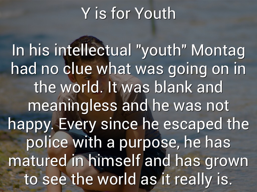 In his intellectual "youth" Montag had no clue what was going on in the world. It was blank and meaningless and he was not happy. Every since he escaped the police with a purpose, he has matured in himself and has grown to see the world as it really is.