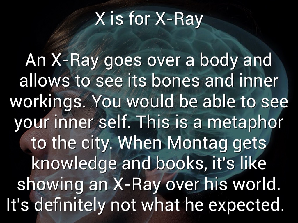 An X-Ray goes over a body and allows to see its bones and inner workings. You would be able to see your inner self. This is a metaphor to the city. When Montag gets knowledge and books, it's like showing an X-Ray over his world. It's definitely not what he expected.