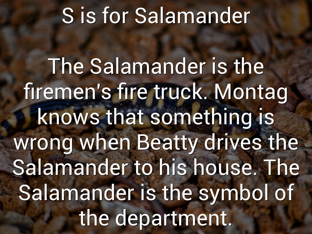 The Salamander is the firemen's fire truck. Montag knows that something is wrong when Beatty drives the Salamander to his house. The Salamander is the symbol of the department.