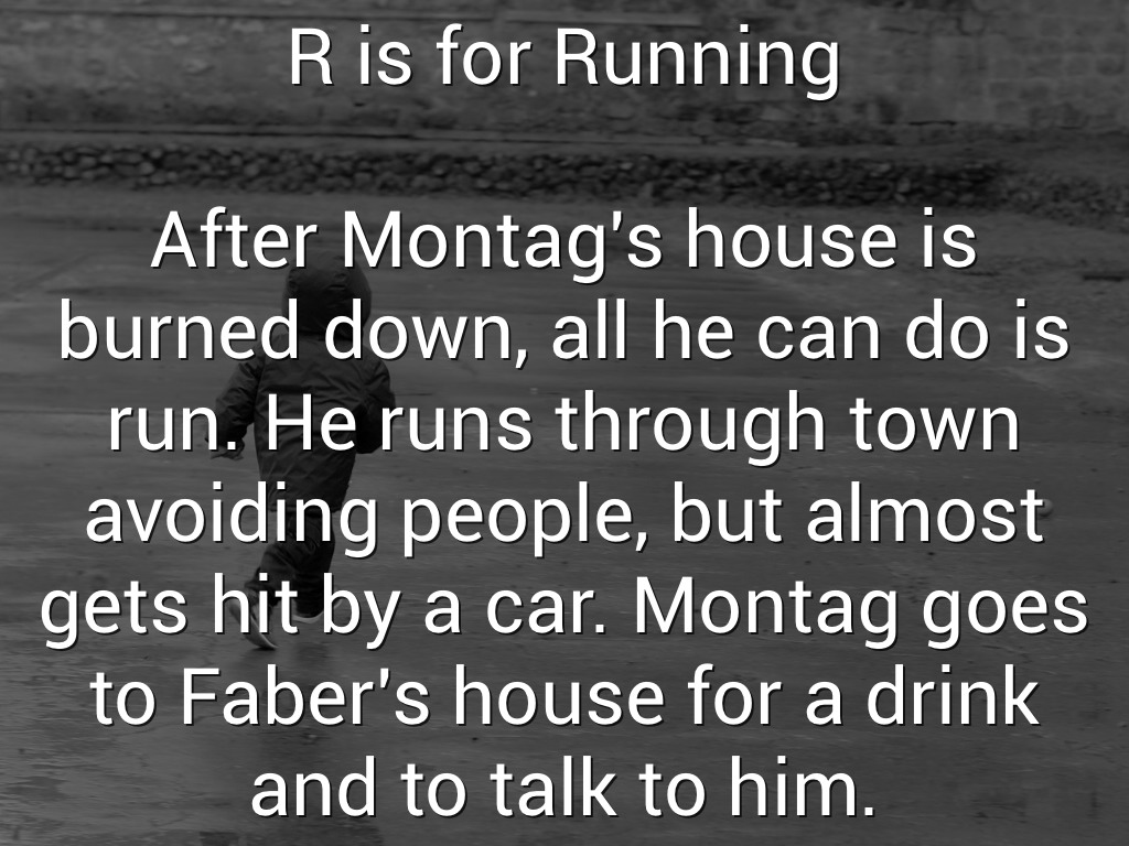 After Montag's house is burned down, all he can do is run. He runs through town avoiding people, but almost gets hit by a car. Montag goes to Faber's house for a drink and to talk to him.