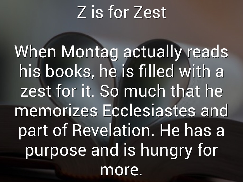 When Montag actually reads his books, he is filled with a zest for it. So much that he memorizes Ecclesiastes and part of Revelation. He has a purpose and is hungry for more.