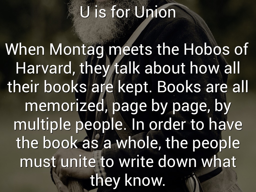 When Montag meets the Hobos of Harvard, they talk about how all their books are kept. Books are all memorized, page by page, by multiple people. In order to have the book as a whole, the people must unite to write down what they know.