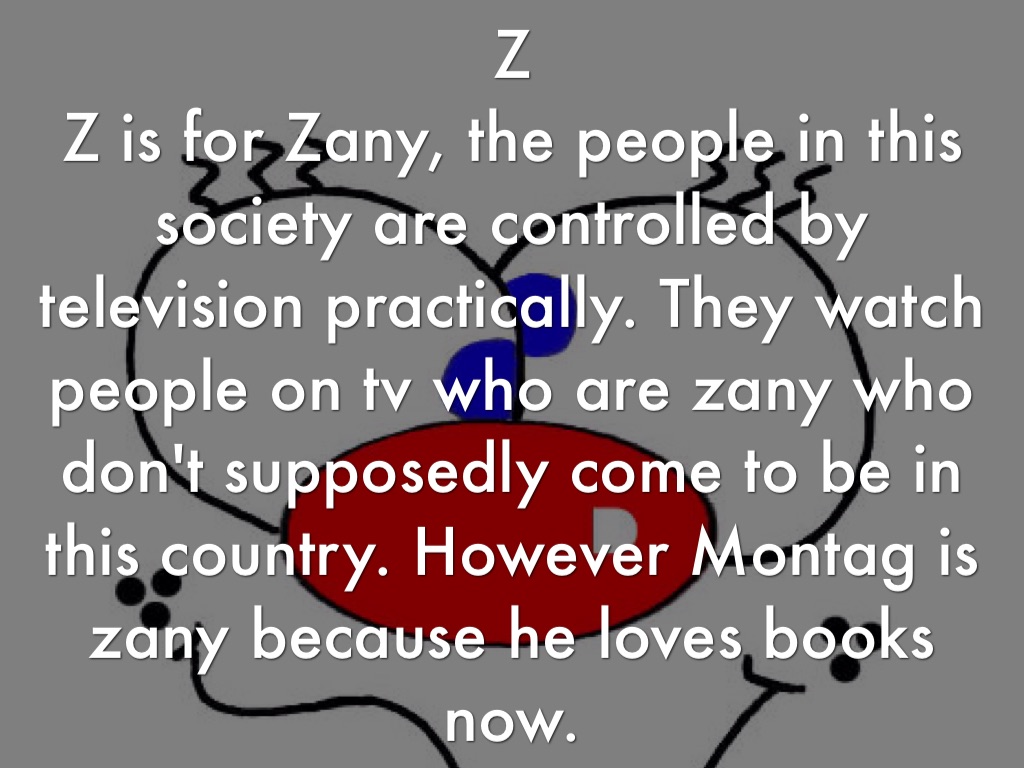 Z is for Zany, the people in this society are controlled by television practically. They watch people on tv who are zany who don't supposedly come to be in this country. However Montag is zany because he loves books now.