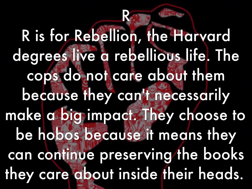R is for Rebellion, the Harvard degrees live a rebellious life. The cops do not care about them because they can't necessarily make a big impact. They choose to be hobos because it means they can continue preserving the books they care about inside their heads.